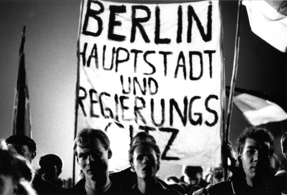 Menschenmenge mit Transparent bei der Wiedervereinigungsfeier vor dem Reichstag