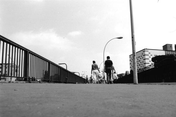 Am Grenzübergang Oberbaumbrücke, während der Zeit der Mauer einer der sieben Straßenübergänge zwischen Ost- und West-Berlin (zwischen sowjetischem und US-amerikanischem Sektor), der nur von Fußgängern benutzt werden durfte.