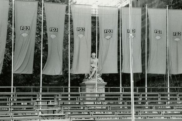 FDJ-Flaggen und Tribüne zum 40. Jahrestag der DDR (