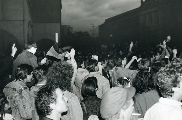 Demonstration vor dem Palast der Republik, wo an diesem Tag die offiziellen Feierlichkeiten zum 40. Jahrestag der DDR stattfanden, siehe auch
