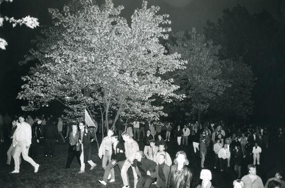 banner (flag), crowd, demonstration, night, October 7, 1989