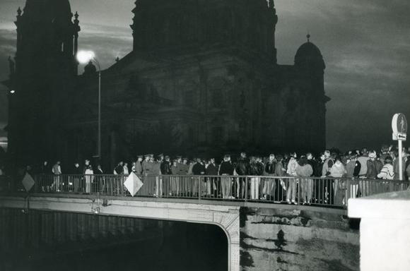 Brücke, Demonstration, Menschenmenge, Nacht, Siebter Oktober 1989, Verkehrsschild, Volkspolizist