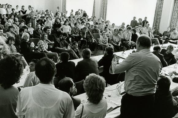 Unter dem Motto "Offene Türen - Offene Worte" finden ab Oktober 1989 in verschiedenen Städten sogenannte "Sonntagsgespräche" zwischen Partei und Bevölkerung statt. Vorne stehend Dr. Christian Hartenhauer, Stadtrat für Kultur und ab Februar 1990 kurzzeitig Oberbürgermeister Ost-Berlins, beim ersten "Sonntagsgespräch" in Ost-Berlin
