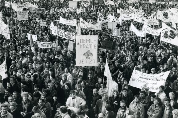 Demonstranten am Palast der Republik bei der Alexanderplatz-Demonstration, der "größte[n] nicht staatlich gelenkte[n] Demonstration in der Geschichte der DDR" (
