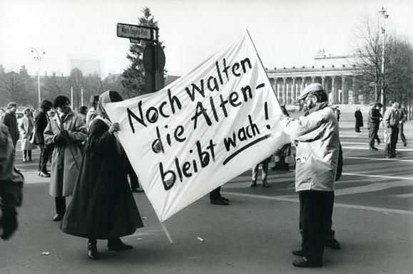 Transparent bei der Demonstration des Künstlerverbandes Berlin vom Presse-Café im Admiralspalast zur Volkskammer im Palast der Republik, aufgenommen auf dem Marx-Engels-Platz (heute Schloßplatz) am Palast der Republik, im Hintergrund das Alte Museum