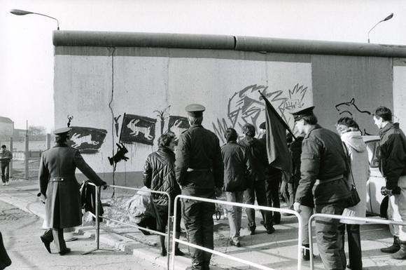 The painted East side of the Berlin Wall at the newly installed Potsdamer Platz border crossing as part of the campaign initiated by the graphic artist Manfred Butzmann, who pleaded in favour of painting the East side of the Berlin Wall on 16 November 1989 at the general assembly of the GDR Visual Artists Union Berlin (Eugen Blume (Publisher): Butzmanns Heimatkunde in 24 Abteilungen, Berlin 1992, p.110-114)