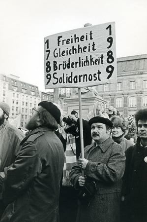 An anti-xenophobia demonstration held by the Neues Forum (New Forum (independent political movement) from the Press Café in Admiralspalast to Platz der Akademie (now known as Gendarmenmarkt); Wolfgang Thierse, who became a member of the Neues Forum in October 1989 is presumably on the left in the foreground