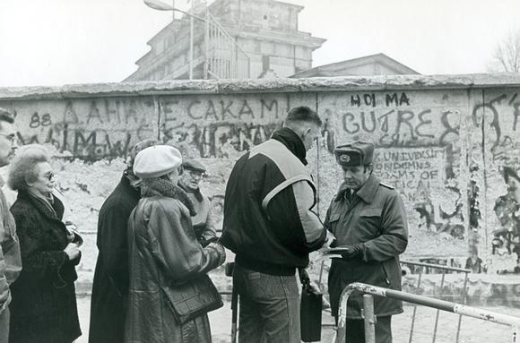 Am Grenzübergang Brandenburger Tor, der am 22. Dezember 1989 feierlich eröffnet wurde. Zur Grenzöffnung durch den damaligen Bundeskanzler Helmut Kohl und den Vorsitzenden des DDR-Ministerrates Hans Modrow erschienen hunderte Kamerateams und mehr als 100.000 Menschen.