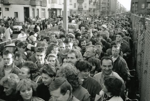Crowds of people gathered at the Bornholmer Strasse border crossing, one of seven street crossings between East and West Berlin (between Soviet and US American sectors) while the Wall was up. The border crossing at Bornholmer Strasse was the first to undergo closure of its passport control facility, occurring on the night of November 9, 1989