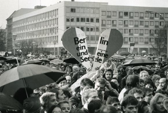 Crowds of people along Unter den Linden Boulevard on the way to the Brandenburg Gate border opening on 22 December 1989. Hundreds of camera teams and more than 100,000 people attended the border opening ceremony led by the then Bundeskanzler, Helmut Kohl and the East German premier, Hans Modrow.
