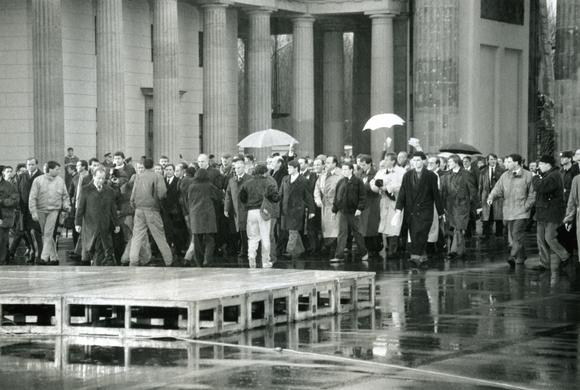 Helmut Kohl, Hans Modrow, Hans-Dietrich Genscher, Walter Scheel, Otto Graf Lambsdorff, Walter Momper and Erhard Krack at the festive opening of the new Brandenburg Gate border crossing on 22 December 1989.