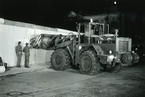 Baumaschine, Berliner Mauer (Ost), Grenzsoldat, Grenzöffnung, Mann, Mauerabbau, Nacht, Zwei Personen