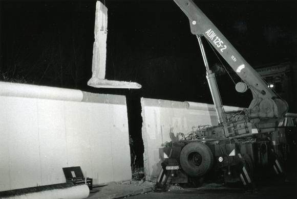 Dismantling the Wall the night before the opening of the border crossing at Brandenburg Gate. The celebratory opening ceremony on December 22, 1989 was carried out by Helmut Kohl and the East German premier, Hans Modrow, attracting more than 100,000 onlookers and hundreds of camera teams