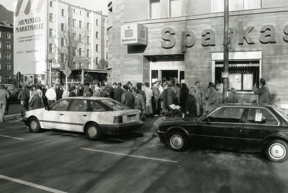 In front of a Berliner Sparkasse bank where "welcome money" was being disbursed