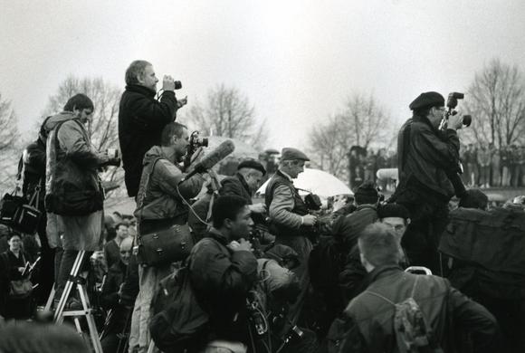 Press reporters presumably waiting for the opening of the border crossing at Brandenburg Gate. The celebratory opening ceremony on December 22, 1989 was carried out by Helmut Kohl and the East German premier, Hans Modrow, attracting more than 100,000 onlookers and hundreds of camera teams