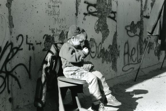 Berlin Wall, Berlin Wall woodpecker, child, chisel traces, one person, piece of the Wall, Wall graffiti