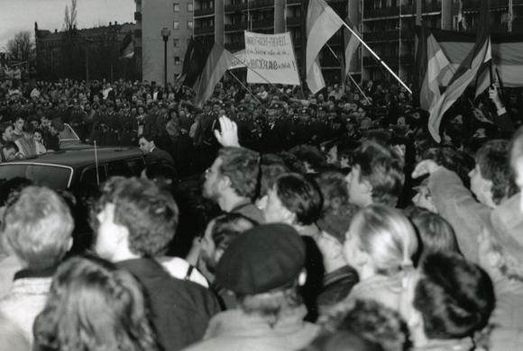 Auto, Flagge Deutschlands, Menschenmenge, Polizeikette, Staatswappen der Deutschen Demokratischen Republik, Transparent (Spruchband)