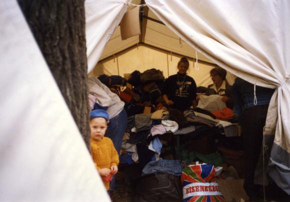 Kleiderzelt im Flüchtlingslager an der Zugliget-Kirche