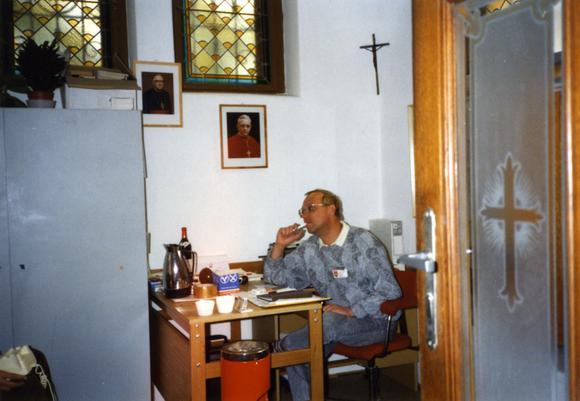 Im Büro der Einsatzleitung im Malteser Hilfsdienst Flüchtlingslager; am 27. August 1989 beginnt in Ungarn ein Großeinsatz des Malteser Hilfsdienstes: "10 000 Flüchtlinge aus der DDR werden in drei Lagern betreut, ehe sie in die alte Bundesrepublik ausreisen dürfen." (