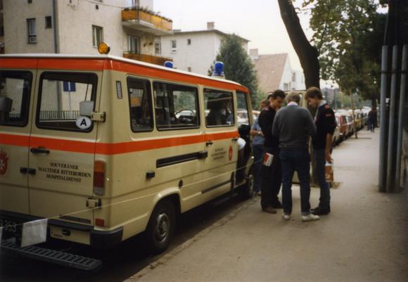 Members of the Malteser emergency services from Austria outside the refugee camp at Zugliget Church in Budapest; a large-scale operation commenced in Hungary on August 27, 1989: "10,000 refugees from the GDR are being cared for in three camps before they are allowed to travel to the Federal Republic of Germany." (Retrieved and translated from