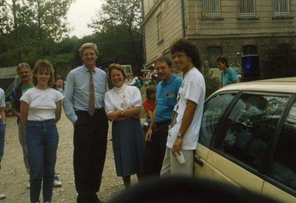 ZDF-Korrespondent Joachim Jauer (2.v.l.) im Flüchtlingslager an der Zugliget-Kirche; Am 27. August 1989 beginnt ein Großeinsatz des Malteser Hilfsdienstes in Ungarn: "10 000 Flüchtlinge aus der DDR werden in drei Lagern betreut, ehe sie in die alte Bundesrepublik ausreisen dürfen." (