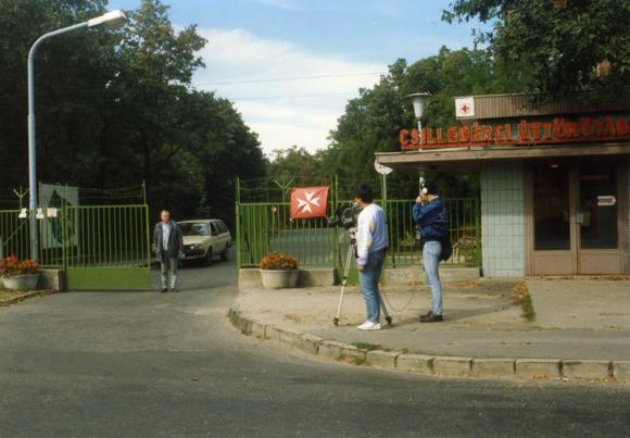 Ein Fernsehteam vor dem Flüchtlingslager Csillebérc; am 27. August 1989 beginnt in Ungarn ein Großeinsatz des Malteser Hilfsdienstes: "10 000 Flüchtlinge aus der DDR werden in drei Lagern betreut, ehe sie in die alte Bundesrepublik ausreisen dürfen." (