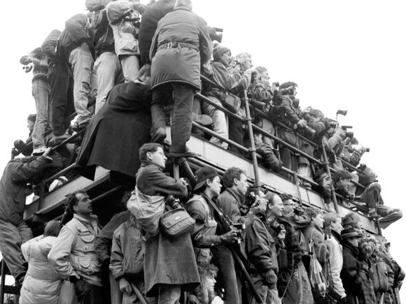 Representatives of the press wait for the opening of the border crossing at Brandenburg Gate. The celebratory opening ceremony was carried out by Helmut Kohl and the East German premier, Hans Modrow on December 22, 1989 and attracted more than 100,000 onlookers and hundreds of camera teams