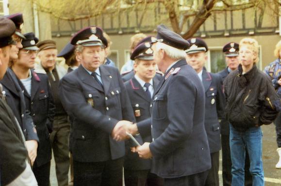 Feuerwehrmänner aus dem hessischen Wanfried und dem thüringischen Treffurt begrüßen sich