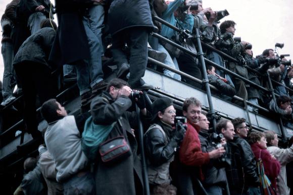 Vertreter der Presse warten auf die feierliche Öffnung des Grenzübergangs am Brandenburger Tor am 22. Dezember 1989. Zur Grenzöffnung durch den damaligen Bundeskanzler Helmut Kohl und den Vorsitzenden des DDR-Ministerrates Hans Modrow erschienen hunderte Kamerateams und mehr als 100.000 Menschen.