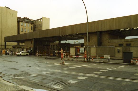 Die Ostseite des Grenzübergangs Friedrichstraße (Checkpoint Charlie), während der Zeit der Mauer einer der sieben Straßenübergänge zwischen Ost- und West-Berlin (zwischen sowjetischem und US-amerikanischem Sektor), der von Ausländern, Angehörigen der alliierten Streitkräfte und Diplomaten benutzt werden musste.