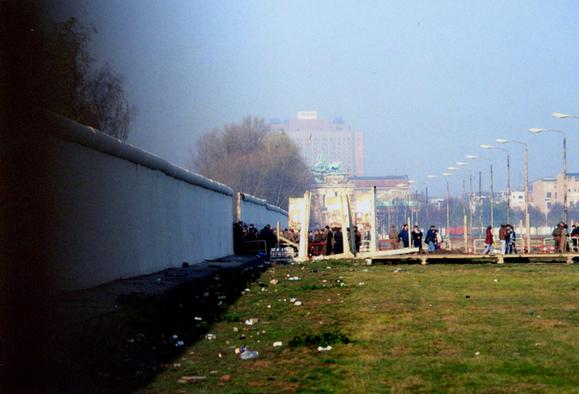 Passanten und Grenzsoldaten im ehemaligen Grenzstreifen mit Lichttrasse am Potsdamer Platz, der ab 12. November 1989 als neuer Grenzübergang diente; im Hintergrund das Brandenburger Tor und die Charité