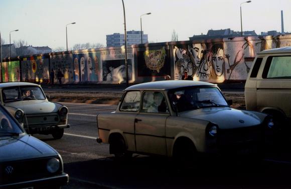 At the 1.3 km-long East Side Gallery in Berlin-Friedrichshain, in front of the Wall art pieces (from left) "Der müde Tod" by Hans-Peter Dürhager and Ralf Jesse (partial), "Dancing to Freedom" by Jolly Kunjappu, "Curriculum Vitae" by Susanne Kunjappu-Jellinek, "Tolerance" by Mary Mackey, "Politik ist die Fortsetzung des Krieges mit anderen Mitteln" by Carsten Jost and Ulrike Steglich, "Flora geht" by Brigida Böttcher, "Parlo d'Amor" by Ignasi Blanch i Gisbert and "Ger-Mania" by Kiddy Citny (partial)