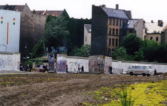 Ein DDR-Krankentransportwagen im ehemaligen Grenzstreifen an der teilweise abgebauten Mauer in Berlin-Kreuzberg