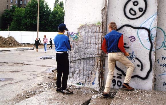 Young Berlin Wall "woodpeckers" in the former border strip; the inner Eastern wall on the left