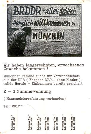 BRDDR - alles deutsch / Herzlich willkommen in / München / Wir haben langersehnten, erwachsenen / Zuwachs bekommen! / Münchner Familie sucht für Verwandtschaft / aus der DDR (37/41 ohne Kinder), / solide Berufe - Einkommen bereits gesichert / 2 - 3 Zimmerwohnung / (Hausmeistererfahrung vorhanden) / Tel: [...]