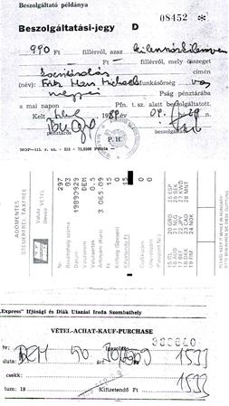 Beszolgaltató példánya / 08452 / Beszolgaltatási-jegy D / 990 Ft fillérol, azaz [...] / Ft fillérol, mely összeget / [...] cimén / (név): Fritz Hans Michael Munkésorseg [...] / Pság pénztárába / a mai napon Pfn. t. sz. alatt beszolgáltatott. / Kelt [...] 1989 év. 04 hó 29 n. / pénztaros beszolgáltaté / Adómentes / steuerfrei, taxfree / Valuta Vetel Deviza / Nr. 297 / Beváltóhely száma 83 / Datum 19890929 / Valutanem DEM / Valutaêrtek 0,5 / Arfolyam (Kurs) 3065,09 / Ft 15 / Költseg (Spesen) 0 / Kiofizetendo Ft 15 / Csekkszam 0 / Utlevelszám 0 / (Passport Nr.) / Please keep it while in Hungary / Bitte bewahren Sie diese Quittung / "Express" Ifjúsági és Diák Utazási Iroda Szomatholy / Vétal-Achat-Kauf-Purchase / DEM 50 [...) 1533 / Kifizetendó Ft 1533