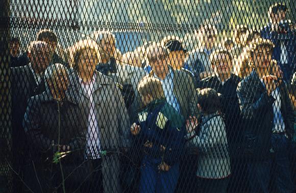 A crowd waits at the new border crossing between Lauenstein, a part of the Bavarian city Ludwigsstadt, and the Thuringian town of Probstzella. The border crossing was opened to pedestrian and road traffic on 12 and 13 November, 1989, respectively. The photo was taken near Falkenstein cliff, after which the border crossing was named.