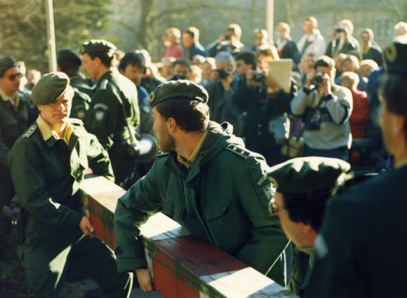 Moving the barricade to open the border between Lauenstein, a part of the Bavarian city Ludwigsstadt, and the Thuringian town of Probstzella. The border crossing was opened to pedestrian and road traffic on 12 and 13 November, 1989, respectively. The photo was taken near Falkenstein cliff, after which the border crossing was named.