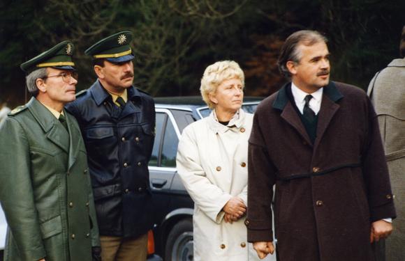 Staatssekretär Gauweiler, die Vorsitzende des Rates des Kreises Saalfeld Edith Ludwig und Polizeipräsident Hoppe am neu eröffneten Grenzübergang zwischen Lauenstein, einem Stadtteil der bayerischen Stadt Ludwigsstadt, und der thüringischen Gemeinde Probstzella. Die Öffnung des Grenzübergangs fand am 12. November 1989 für Fußgänger und am 13. November 1989 für den Straßenverkehr statt. Die Aufnahme entstand in der Nähe des Felsens Falkenstein, der dem Grenzübergang den Namen gibt.