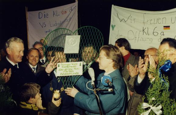 Beim Besuch des bayerischen Ministerpräsidenten Streibl anlässlich der Eröffnung des Grenzübergangs zwischen Lauenstein, einem Stadtteil der bayerischen Stadt Ludwigsstadt, und der thüringischen Gemeinde Probstzella. Die Öffnung des Grenzübergangs fand am 12. November 1989 für Fußgänger und am 13. November 1989 für den Straßenverkehr statt.