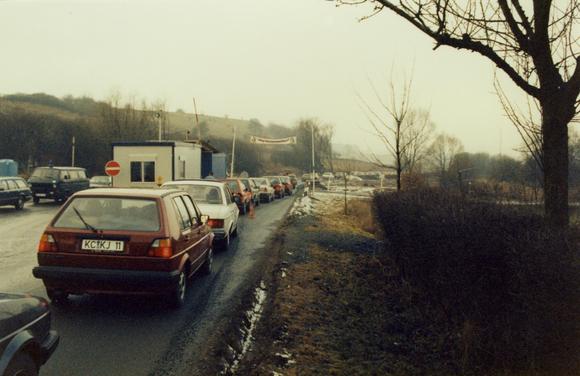 Stau am Grenzübergang zwischen dem bayerischen Burggrub (Stockheim) und Neuhaus-Schierschnitz im Thüringer Landkreis Sonneberg, der am 24. November 1989 eingerichtet wurde