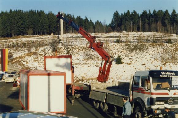 Containeraufstellung am Grenzübergang zwischen Spechtsbrunn, einem Ortsteil der thüringischen Gemeinde Oberland am Rennsteig, und dem bayerischen Tettau, der am 24. November 1989 eingerichtet wurde