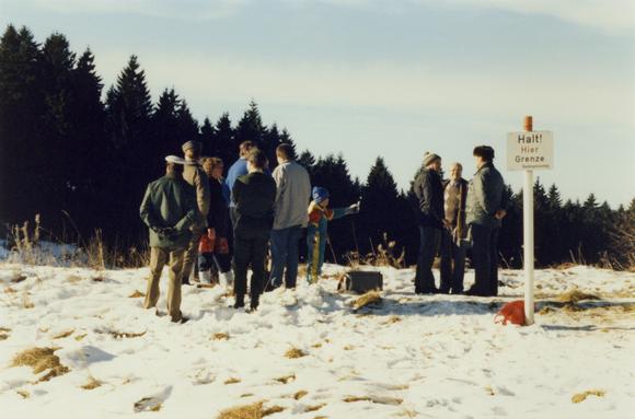 Polizisten der BRD, Grenzsoldaten und Passanten am Grenzübergang zwischen Sattelpaß bei Neuenbau im thüringischen Landkreis Sonneberg und dem bayerischen Tettau, der am 1. Dezember 1989 eingerichtet wurde