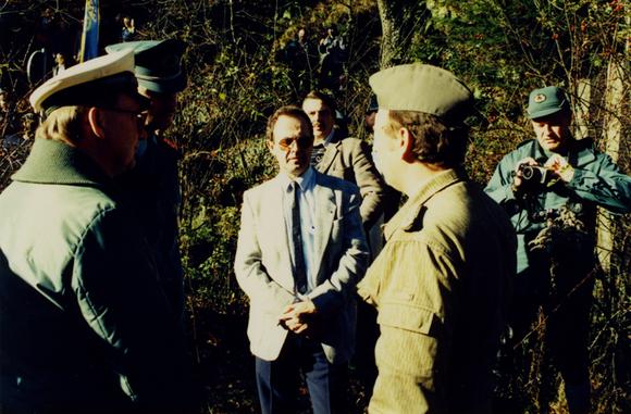 Police officers from East and West in conversation at the newly opened border crossing between Lauenstein, a neighborhood of Ludwigsstadt (Bavaria) and the town of Probstzella (Thuringia). The border was opened to pedestrian and auto traffic on 12 and 13 November 1989, respectively. The photo was taken near Falkenstein cliff, after which the border crossing is named.