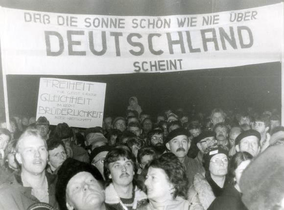 The demands of the people were manifold at this protest. A large portion of the participants brought forth ecological grievances in Weimar, while others were concerned with the misuse of authority by communal representatives. It became apparent that there were advocates for a unified Germany and suppporters of a new, different GDR." (Klaus Bergmann: Weimar-Demos 1989/90 in Bildern. Weimar 1992, pp. 26)