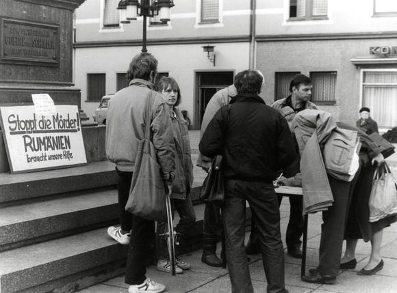 A solidarity campaign for Romania at the Goethe and Schiller monument in front of the Deutschen Nationaltheater; after violent conflicts, the revolution in Romania ended on December 25, 1989 after the victory of the opposition and the execution of dictator, Nicolae Ceauşescu (