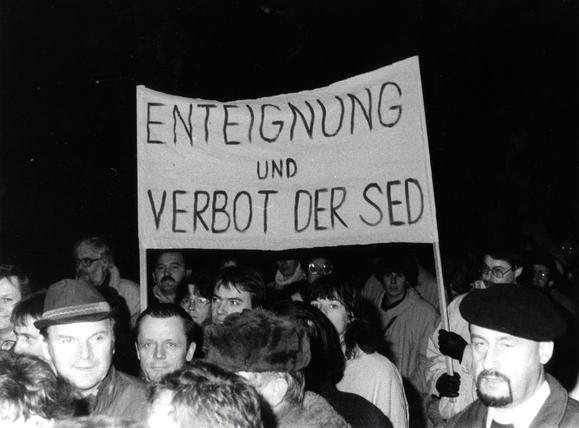 Protest banner: "Condemnation and prohibition of the SED"