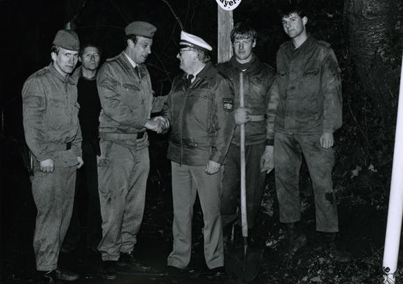border guard, group of people, inner German border, man, night, opening of the border, policeman (FRG), state coat of arms, warning sign