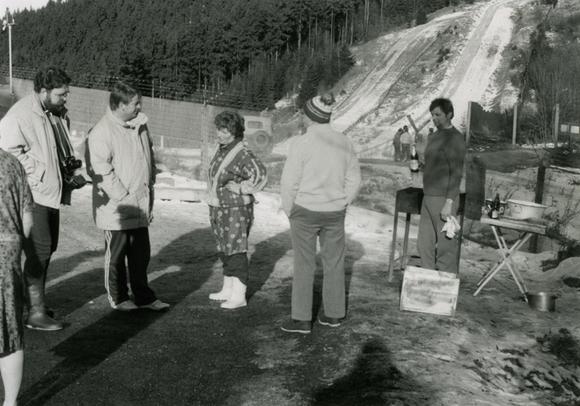 Pedestrians in the border strip between Lauenstein, a neighborhood in the Bavarian city Ludwigsstadt, and the Thuringian town of Probstzella. The border was opened to pedestrians on 12 November and to road traffic on 13 November 1989. The picture was taken near Falkenstein cliff, after which the border crossing was named.