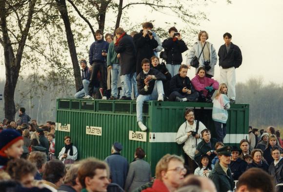 "It kind of looked as if people were queuing up at the container. But in actual fact, they were looking towards Potsdamer Platz where the Wall was supposed to be opened. The place was full of excited, happy faces. There was a veritable babble of voices with the occasional call: 'When are we ever going to get over to the other side?'"